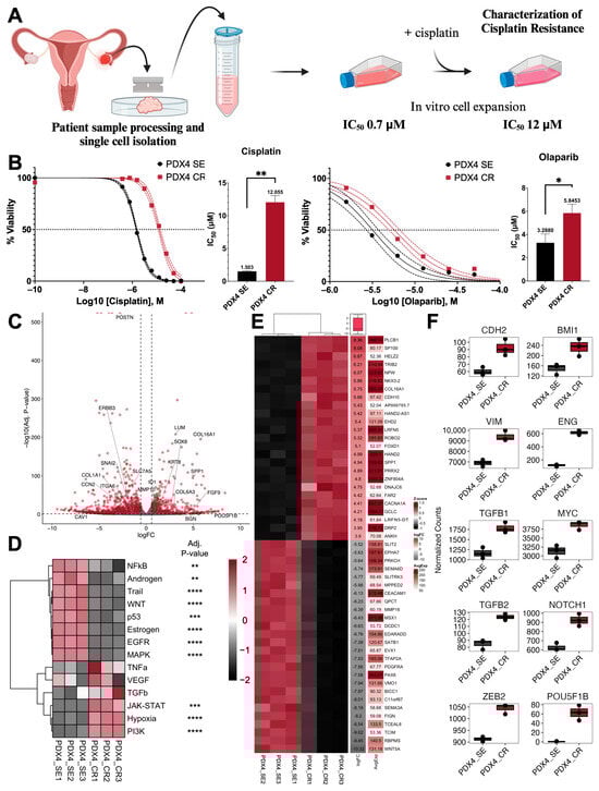 PDX4, a high-grade serous ovarian cancer (HGSOC) sample, was obtained as previously described from a chemotherapy naïve patient []. In vitro, the cells were described as epithelial-like, with a low migration rate but high spheroid forming capacity compared to additional patient-derived samples; this and other characteristics (including tumorigenicity) made this a sample with high stemness attributes []. PDX4 was also determined to be BRCA2 mutant and homologous recombination deficient via clinical testing []. Furthermore, in vivo, PDX4 demonstrated high tumorigenicity when orthotopically injected into the ovarian bursae of nude mice []. To further characterize this cell line, cisplatin-resistant PDX4 (referred to as PDX4 CR throughout the remainder of the study) was generated through continual and repeated exposure to increasing concentrations of cisplatin (Figure 1A). A final cisplatin concentration of 8.5–10 µM was determined to be the maximal clinically relevant concentration that is observed in the plasma of patients; therefore, it was designated as the endpoint for further characterization [,,]. Compared to vehicle-treated control cells (cisplatin-sensitive PDX4; PDX4 SE), PDX4 CR had an 8- and 1.8-fold increase in cisplatin and olaparib IC50, respectively (Figure 1B). At the transcript level, RNA sequencing revealed over 7500 genes that were differentially expressed, with 3890 genes that were downregulated and 3616 genes that were upregulated in the chemoresistant cell line (adjusted p-value < 0.1; Figure 1C and Table S1). PROGENy algorithms were then utilized to identify signaling pathways that could be contributing to the differences observed between the two groups (Figure 1D). PDX4 CR displayed a significant activation of genes within the hypoxia, PI3K, and JAK-STAT signaling pathways, while NF-κB, androgen, TRAIL, WNT, p53, estrogen, EGFR, and MAPK pathways were significantly downregulated. Database searches revealed that out of the top 50 differentially expressed genes, 2 genes have previously been associated with cisplatin resistance (XAF1 and TRIB2) [], 7 with EMT (CCAT2, EVPL, SATB1, PDGFRA, BICC1, SFRP1, and WNT5A) [], and 23 with stemness [] (Figure 1E and Table S2). Furthermore, markers and promoters of EMT, CDH2, VIM, TGFB1, TGFB2, and ZEB2 were upregulated in the resistant sample, while genes associated with pluripotency and stemness, BMI1, ENG, MYC, NOTCH1, and POU5F1B, were upregulated in PDX4 CR (Figure 1F).