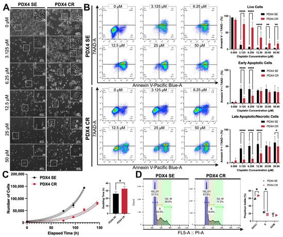 Growth characteristics of PDX4 CR after cisplatin treatment. (A) After three days of cisplatin treatment (0–50 µM), PDX4 SE and CR were imaged at 10× magnification. Cell morphologies are highlighted in each panel with an inlaid panel (white box) of 2× magnification (total magnification 200×). Scale bar: 100 µm. (B) Representative FACS profiles of PDX4 SE and CR cells stained with Annexin V-Pacific Blue (PB) and 7-aminoactinomycin D (7AAD) after 72 h of cisplatin treatment (0–50 µM). Quantification of live Annexin V−/7AAD− (top), early apoptotic Annexin V+/7AAD− (middle), and late apoptotic/necrotic Annexin V+/7AAD+ and Annexin V−/7AAD+ (bottom) cells. Percent positive cells were gated from single, intact cells. (C) Analysis of cell proliferation using MTT assay. PDX4 SE and CR were seeded at 1000 cells per well on day zero and allowed to grow for 96–144 h (4–6 days). Doubling time was determined from the exponential (Malthusian) growth curve (n = 3). Data are presented as mean ± SD. Curve fitting and doubling time were calculated using GraphPad Prism software. Black bars in (B,C): PDX4 SE; red bars: PDX4 CR. (D) Cell cycle analysis using flow cytometry (left). Untreated PDX4 SE and CR cells were stained with FxCycle™ propidium iodide/RNase staining solution. Percent distribution of cells through the different cell cycle stages (right). All flow cytometry data were collected with a MACSQuant Analyzer 10 and analyzed with FlowJo software. * p < 0.05, ** p < 0.01, **** p < 0.0001. Created with Biorender.com, accessed on 31 July 2023.