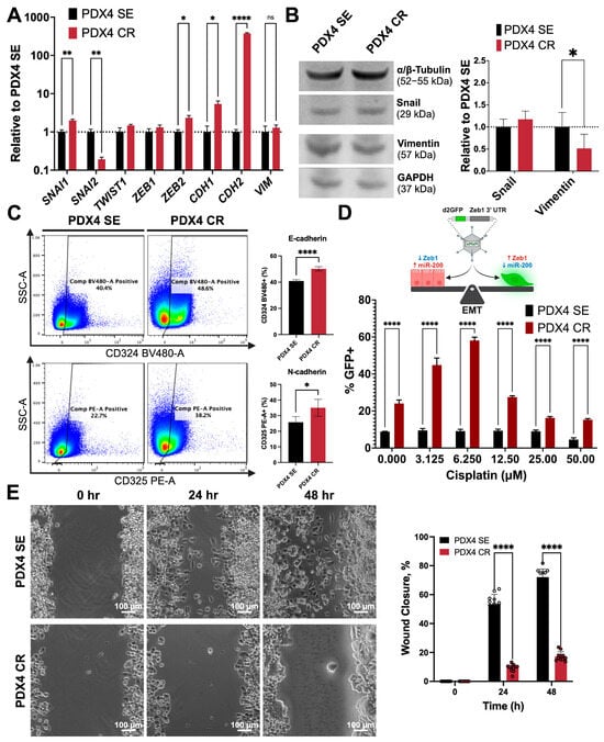 PDX4 SE and CR cells exhibit hybrid/partial EMT phenotypes. (A) RT-qPCR validation of EMT transcription factors and markers. Expression levels are relative to the sensitive cell line. Results are presented as the means ± SD. (B) Protein quantification of Snail and Vimentin through Western blot, normalized to either α/β-tubulin or GAPDH. Expression levels are relative to PDX4 SE. (C) Representative pseudocolor flow cytometry dot plots (left) for the expression of E-cadherin (CD324) and N-cadherin (CD325). Colors on dot plot represent cell density (cool colors: low density; warm colors: high density). Quantification of single and double positive populations (right). Percent positive cells were obtained from single, intact, live cells. (D) The Zeb1 3′UTR GFP reporter (Toneff et al., 2016 []) detects the presence of miR-200 within cells. In the presence of miR-200, its binding to the Zeb1 3′UTR (arrow pointing to left) silences GFP expression; in the absence of miR-200 GFP is expressed (arrow pointing to right). PDX4 SE and CR cells were transduced with the lentiviral reporter system and treated with cisplatin (0–50 µM) for 72 h. Quantification of GFP expression was measured through flow cytometry. GFP-positive populations were obtained from single, intact cells that were Annexin V−/7AAD−. All flow cytometry data were collected with a MACSQuant Analyzer 10 and analyzed with FlowJo software. (E) Migration capacity was determined through 24- and 48-h scratch wound healing assays (n = 12). Black bars: PDX4 SE; red bars: PDX4 CR. Results are presented as the means ± SD. Statistical significance was determined by two-way ANOVA with Tukey’s test for multiple comparison correction. p-values: p ≤ 0.05 (*); p ≤ 0.01 (**); p ≤ 0.0001 (****); ns, not significant. Created with Biorender.com, accessed on 1 August 2023.