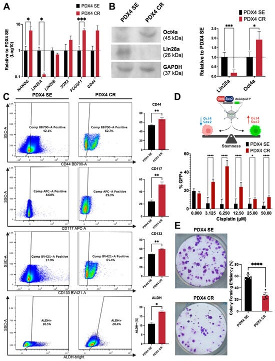 Cisplatin-resistant cells express more stemness markers but are less clonogenic. (A) RT-qPCR validation of pluripotency and stemness markers. Expression levels are relative to the sensitive cell line. Results are presented as the means ± SD. (B) Protein quantification of Lin28a and Oct4a through Western blot, normalized to GAPDH, relative to PDX4 SE. (C) Representative flow cytometry pseudocolor dot plots (left) for the expression of cell surface markers CD44 (first row), CD117 (c-Kit; second row), CD133 (PROM1; third row), and ALDH (last row). Comparison of single positive populations between PDX4 SE and CR (right). Percent positive cells were obtained from single, intact cells. ALDH gates were drawn based on DEAB-treated cells. Colors on dot plot represent cell density (cool colors: low density; warm colors: high density). (D) The SORE6 GFP reporter (Tang et al., 2015 []) detects the presence of SOX2 and Oct4 within cells. In the presence of OCT4 and SOX2, they bind to SORE6 elements (arrow pointing to right) and activate GFP expression; in their absence GFP is not expressed (arrow pointing to left). PDX4 SE and CR cells were transduced with the reporter system and treated with cisplatin in increasing concentrations (0–50 µM) for 72 h. Quantification of GFP expression was measured through flow cytometry. GFP-positive populations were obtained from single, intact cells that were Annexin V−/7AAD−. All flow cytometry data were collected with a MACSQuant Analyzer 10 and analyzed with FlowJo software. (E) Representative images of PDX4 SE and CR colonies that were grown for 10–11 days in a 6-well plate (well diameter = 35-mm; left). Images were acquired with an HP scanner. Colony-forming efficiency was calculated relative to the number of plated cells (n = 6; right). Results are presented as the means ± SD. Statistical significance was determined using the unpaired t-test. p-values: p ≤ 0.05 (*); p ≤ 0.01 (**); p ≤ 0.001 (***); p ≤ 0.0001 (****). Created with Biorender.com, accessed on 19 September 2023.