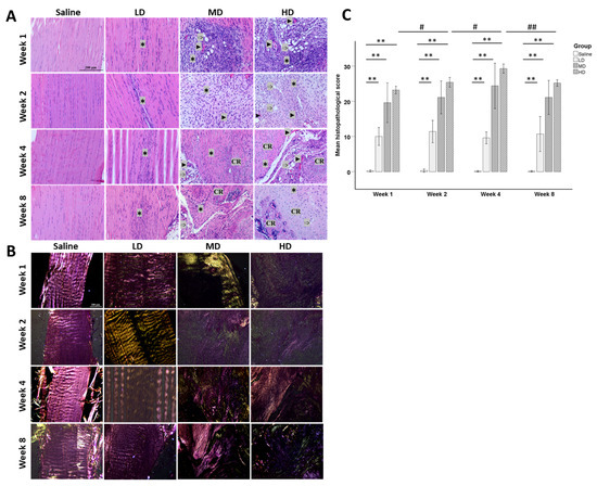 Histopathology of patellar tendons at different time points after saline or collagenase injection. (A) Photomicrographs showing the histopathological changes of the patellar tendons after injection with different concentrations of collagenases (LD: low dose; MD: medium dose; HD: high dose) at weeks 1, 2, 4, and 8. Scale bar: 200 µm; stain: haematoxylin and eosin; ✱: hypercellularity; ►: blood vessels; ➩: fat accumulation; CR: calcified region. (B) Polarized images of tendons. Scale bar: 200 µm. (C) Bar chart showing the mean histopathological scores of different groups at different time points. n = 5/time point/group; ** post hoc p < 0.01 compared to the saline group; # p < 0.05; ## p < 0.01 compared to different time points of the same group.