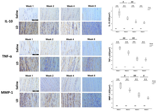 Expression of inflammatory cytokines and matrix-degrading enzyme in tendons after collagenase injection. Photomicrographs showing immunohistochemical staining of IL-10, TNF-α, and MMP-1 in the injured tendons at different times in the saline and LD groups. Scale bar: 100 µm. The boxplots show semiquantitative image analysis of MMP-1, IL-10, and TNF-α signal intensity (IOD/µm2) of the saline group and LD group at different time points. n = 5/time point/group; ** post hoc p < 0.01 compared to the saline group; # p < 0.05; ## p < 0.01 compared to different time points of the same group.