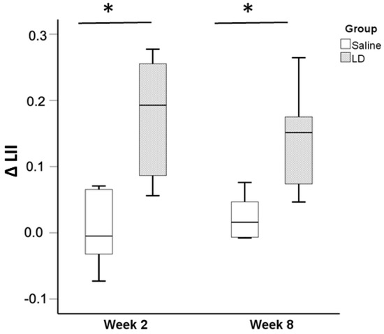 The changes of limb idleness index (ΔLII) compared to preinjury state was significantly higher in the LD group compared to the saline group at week 2 and week 8 post-injury (both p < 0.05) (Figure 4). There was no significant change in ΔLII from week 2 to week 8 in both groups (both p > 0.05) (Figure 4).