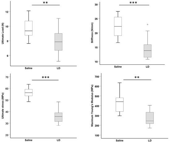 Biomechanical properties of the patellar–patellar tendon–tibia composite after injury. Boxplots showing ultimate load (N), stiffness (N/mm), ultimate stress (MPa), and maximum Young’s modulus (MPa) of the saline and LD groups at week 8 post-injection. n = 15/group; ** p < 0.01; *** p < 0.001. “o” above the LD group represents outliner of the dataset with the value of between 1.5 and 3 box-lengths from the 75th percentile.