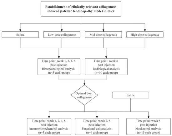 Clinical samples of degenerative tendinopathy are useful for understanding the disease pathogenesis. However, they are usually obtained only at the late stage of the disease that requires surgery. The availability of animal models would facilitate the research of the disease pathogenesis and treatment. Both overuse- and collagenase-induced tendon injuries are frequently used for the development of tendinopathy animal models [16]. Rat, rabbit, dog, and horse models of tendinopathy were available for research [16]. Mice are frequently used for the development of animal models of various human diseases due to their short life cycle and availability of advanced tools such as transgenic animal models and antibodies. There is no mouse model of patellar tendinopathy, which impedes the research in this field. Tendinopathy is previously considered as a degenerative disease with an absence of infiltration of inflammatory cells in histology. Notwithstanding the argument, signs of inflammation were reported in clinical samples [6,7]. Inflammation is now recognized as a key component in the pathogenesis of tendinopathy and is a target for intervention. This study therefore aimed to establish a mouse model of inflammatory and degenerative patellar tendinopathy by collagenase injection, which will facilitate the study of molecular pathogenesis and treatment using advanced molecular tools. We hypothesized that a mouse patellar tendinopathy model that exhibits key histological and clinical characteristics of tendinopathy could be established. Histopathological changes of tendinopathy including hypercellularity, hypervascularity, loss of cell alignment, cell rounding and extracellular matrix (ECM) degeneration, fat infiltration, chondrocyte-like cells, and ectopic bone formation could be observed in this animal model. The injured tendon would also presented with an upregulation of inflammation. There would be a change in gait pattern due to tendon pain and a decrease in the biomechanical properties of the injured tendon.