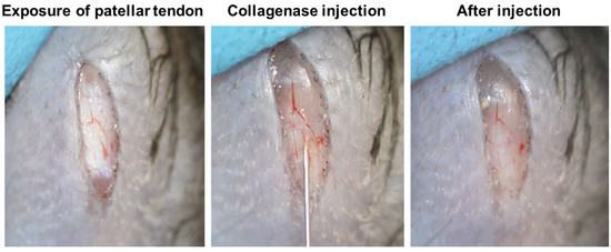 Photographs showing the surgical procedures of collagenase injection over the mouse patellar tendon. Briefly, a longitudinal skin incision was made and the patellar tendon was exposed. Bacterial collagenase I was then injected between the fascia and patellar tendon with a 32G needle. There was no leakage of collagenase after collagenase injection.