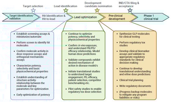 Generalized drug discovery pipeline and activities. Biopharmaceutical drug discovery programs follow a step-wise progression, shown inside chevrons. Stars highlight key milestones in a program that can gate the next waves of activities once achieved. Boxes highlight some key activities performed during three stages of drug discovery. Bulleted examples are typical of small molecule discovery; activities may vary for other modalities. GLP—good laboratory practices (regulatory standard); IND—investigational new drug (FDA regulatory documentation for Ph1 trials); CTA—clinical trial application (European Medicines Agency regulatory documentation for Ph1 trials).