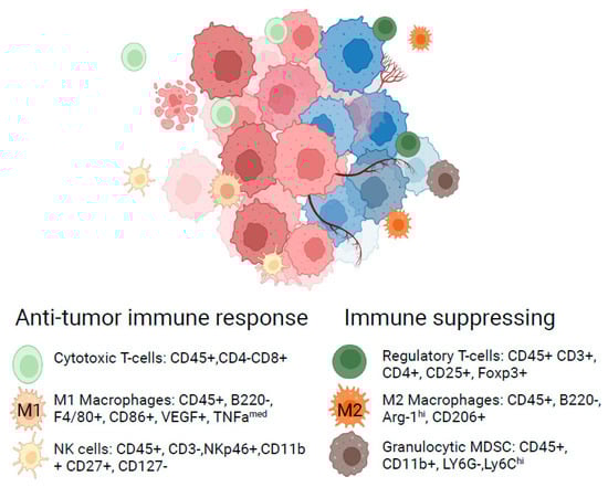 Evaluation of signaling events and biomarker expression with single-cell resolution has been transformational for the field of immuno-oncology, representing one of the best examples of the impact of flow cytometry to transform the understanding of disease biology. The emergence and approval of antibody therapies targeting CTLA4 and PD-L1 in cancer provided a clinical rationale for harnessing the host immune system with therapeutics to respond against tumors [,]. However, the understanding of preclinical immuno-competent syngeneic tumor models and their translational relevance was only recently characterized in detail. In a seminal paper published by a group from Medimmune, flow cytometry and transcriptomics approaches were used to systematically characterize six widely used syngeneic tumor models, revealing a striking difference in the composition of infiltrating immune cells. Models could be categorized as immune-infiltrated or immune-barren by quantifying cells expressing the hematopoietic lineage marker CD45 and revealed differences in immune composition measured by differences in the ratio of CD4+ T cells, CD8+ T cells, and myeloid cells []. Additional surface markers can further distinguish cytotoxic immune populations and immune-suppressing cell populations, which exist in homeostatic balance (Figure 3). This differential immune composition is also reflective of human tumors [], providing insights into their translational relevance. Follow-up studies explored three of the most widely used models, CT26, MC38, and 4T1, further revealing the kinetics of immune recruitment over time, enabling optimal PD timepoint selection, and providing further insight into cellular cross-talk during an immune response to a tumor [].