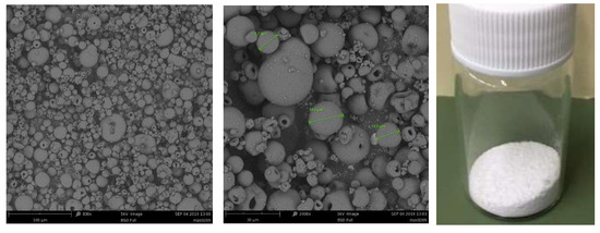 Particle size and morphology were measured by scanning electron microscopy (SEM) using a Phenom ProXSEM. All SEM analyses were performed at 25.0 °C ± 0.1 °C. The average diameter (d) ± standard deviation (SD) (mean ± SD) of the microparticles was determined from the mean value of 100 measurements using ImageJ (Madison, WI, USA, version 1.46 v).