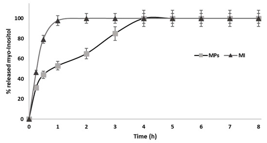 The in vitro release of the MI embodied in the micro delivery systems was assessed using a dialysis bag method [30]. Microparticles equivalent to 100 mg were dispersed in 5 mL of 0.1 M HCl and poured into a cellulose ester dialysis membrane (cut off: 12–14 kDa) and sealed with appropriate universal closures (Spectrum chemical MFG Corp). This constitutes the donor compartment, which is then immersed in 95 mL of 0.1 M HCl (receiving compartment). The system (receiving + donating compartments) is thus maintained at pH = 1 under stirring and a constant temperature (100 rpm, 37 °C) for 2 h, making withdrawals at 10, 20, 30, 60, and 120 min. After 2 h, the pH of the receiving compartment is increased to pH 6.8 to mimic the first tract of the intestine. This pH is maintained for the following 4 h. It follows a further pH increase to pH 7.2 to mimic the environment of the colon until the last sampling is made, 24 h from the beginning of the experiment. A “myo-inositol assay kit K-INOSL” was used to determine the amount of released MI. Each sample was analyzed individually: in the first phase, the sample was incubated in a neutral environment in the presence of ATP and Hexokinase; then, it was brought to the basic environment, and other enzyme components of the kit were added and the absorbance at 492 nm was read using a PC Shimadzu Recording Spectrophotometer UV. Finally, the colorimetric reaction is triggered and, after an incubation period, the absorbance at 492 nm is read again: the reaction between the colored compound and MI is stoichiometric, enabling a calculation of the amount of MI present in the samples.