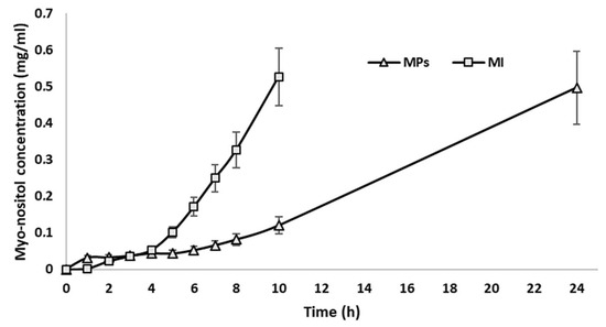 Myo-inositol released from the spray-dried batch n. 3 (MPs) and pure myo-inositol (MI). During the first 2 h, the pH of the receiving compartment was pH 1; then, it increased to pH 6.8 for the next 4 h. A further pH increase to pH 7.2 followed at 6 h.