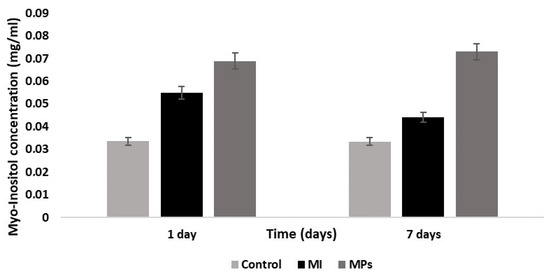 Plasma samples (approximately 60 µL) were obtained by centrifugation of the blood samples (100 µL) at 10,000 rpm for 5 min and immediately cryopreserved at −80 °C. To verify whether the presence of plasma proteins could interfere with the myo-inositol test, preliminary tests were carried out on blood samples from the control group. In this regard, plasma samples (25 µL) of the control group were deproteinized by adding 1N trifluoroacetic acid (100 µL), cooling in an ice bath for 10 min, and centrifugation at 4500 rpm for 10 min, and the supernatants were analyzed with the K-INOSL Megazyme kit after neutralization with a 1 N NaOH solution (100 µL). From the analysis of the results, no difference was observed with non-deproteinized blood samples. Consequently, the concentration of MI in each plasma sample was determined by directly analyzing 25 µL of plasma with the K-INOSL Megazyme kit. The ovarian follicles taken after 24 h (single administration) and 7 days (once-daily administration for 7 days) were homogenized with 800 µL of distilled water using an Ultraturrax homogenizer at 20,000 rpm for 5 min. The homogenates obtained were added to 1N trifluoroacetic acid (100 µL), placed in an ice bath for 10 min, and centrifuged at 4500 rpm for 10 min at 5 °C. The decanted supernatant (900 µL) was neutralized with a 1 N NaOH solution (100 µL) and finally filtered with 0.2-micron regenerated cellulose filters before analysis with the K-INOSL Megazyme kit, in 100 µL aliquots.