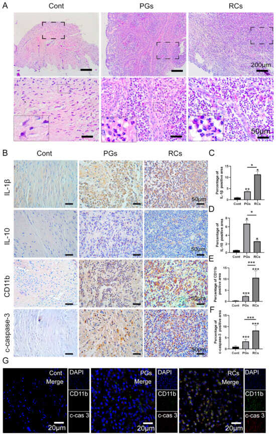 The infiltration of apoptotic neutrophils in the periapical regions. (A) Hematoxylin and eosin staining (scale bar = 200 μm) showing inflammatory infiltrates under different magnifications in healthy control tissues, PGs and RCs. (B) Immunohistochemical staining (scale bar = 50 μm) of Interleukin (IL)-1β, IL-10, CD11b and c-caspase-3 in the periapical region of healthy individuals and those with PGs and RCs. (C–F) The quantification of (C) IL-1β, (D) IL-10, (E) CD11b and (F) c-caspase-3 in each group. The results are expressed as the area of double-positive cells/mm2; * p < 0.05, ** p < 0.01, *** p < 0.001 (G) CD11b-c-caspase-3 double labeling (scale bar = 20 μm) in each group. Cont, healthy control; PGs, periapical granulomas; RCs, radicular cysts; c-cas3, c-caspase3.
