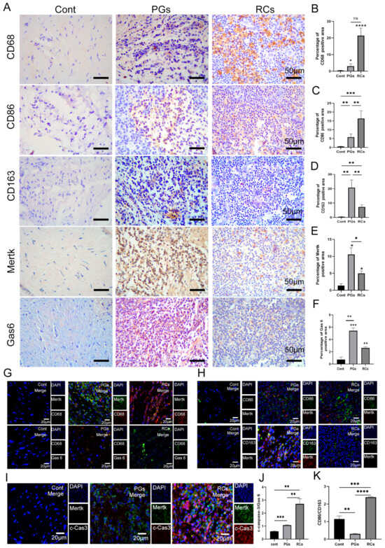 Macrophage efferocytosis and polarization in the periapical regions. (A) Immunohistochemical staining (scale bar = 50 μm) of Mertk, Gas6, CD68, CD86 and CD 163 in the periapical region of healthy individuals and those with PGs and RCs. (B–F,K) The quantification of (B) CD68, (C) CD86, (D) CD163, (E) Mertk, (F) Gas6 and (K) M1/M2 ration in each group. The results are expressed as the area of immune-positive cells/mm2. (G) Mertk-CD68 and Gas6-CD68 double labeling (scale bar = 20 μm) in each group. (H) Mertk-CD86 and Mertk-CD163 double labeling (scale bar = 20 μm) in each group. (I,J) Mertk-Cas3 double labeling (scale bar = 20 μm) in healthy control group, PGs and RCs region. * p < 0.05, ** p < 0.01, *** p < 0.005, **** p < 0.001, ns. p > 0.05. Cont, healthy control; PGs, periapical granulomas; RCs, radicular cysts; c-cas3, c-caspase3.
