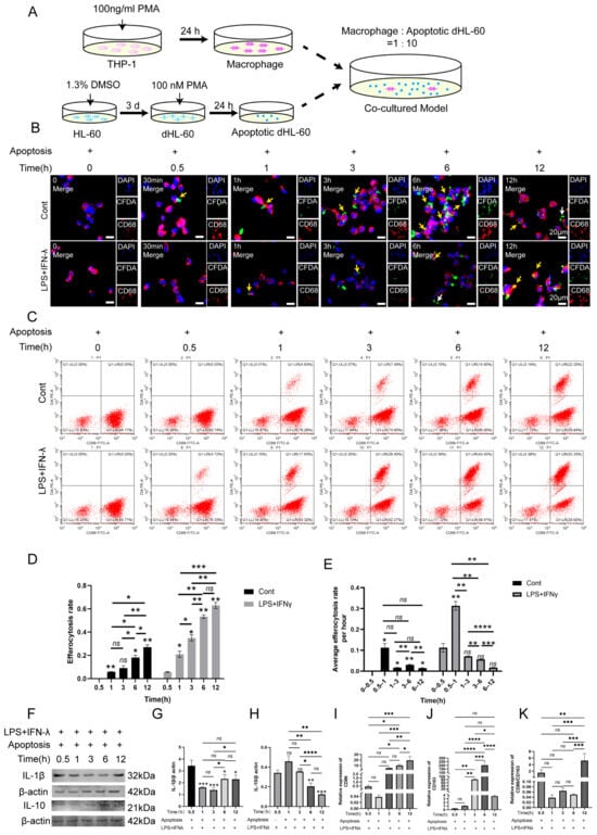 The correlation with macrophage efferocytes and macrophage polarization in inflammatory condition. (A) The schematic drawing of the co-culturing cell model. (B) The co-cultured cell model of apoptotic neutrophils and macrophages under normal and Pg. LPS+IFN-γ-stimulated condition. IF staining was conducted to detect the efferocytosis capacity. Yellow arrow: the engulfment of apoptotic cell by macrophages; white arrow: the apoptotic cell that was not engulfed by macrophages. Green, apoptotic neutrophils; red, macrophages; blue, DAPI. Scale bar = 20 μm. (C) The co-cultured cell model of apoptotic neutrophils and macrophages under normal and Pg. LPS+IFN-γ-stimulated condition detected by flow cytometry. The upper right quadrant: PKH26+ and CD68+ cells, which represent the macrophages that engulf the apoptotic neutrophils. The lower right quadrant: PKH26− and CD68+ cells, which refer to the macrophages that did not engulf the apoptotic neutrophils. (D,E) The quantification of efferocytosis rate and average efferocytosis rate per hour. (F–H) Representative immunoblotting images and quantification of IL-10 (F,H), IL-1β (F,G) in co-cultured cell model under normal and inflamed conditions. (I–K) The expression of CD86 and CD163 was detected via RT-PCR. (K) The M1/M2 ration was calculated according to the expression of CD86 and CD163. * p < 0.05, ** p < 0.01, *** p < 0.005, **** p < 0.001, ns. p > 0.05.