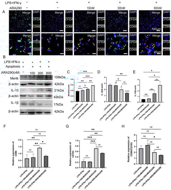 The enhanced capacity of macrophage efferocytosis could promote M2 macrophage polarization in inflammatory conditions. (A) The co-cultured cell model of apoptotic neutrophils and macrophages under Pg. LPS+IFN-γ-stimulated conditions with treatment of 100 nM, 300 nM and 600 nM ARA290 detected by immunofluorescence staining. Yellow arrow: the engulfment of apoptotic cell by macrophages; white arrow: the apoptotic cells that had not been engulfed by macrophages. Green, apoptotic neutrophils; red, macrophages; blue, DAPI. Scale bar of upper figure = 100 μm, scale bar of lower figure = 25 μm. (B–E) Representative immunoblotting images of different antibodies as indicated and their quantification. (F,G) The expression of CD86 and CD163 was detected via RT-PCR. (H) The M1/M2 ration was calculated according to the expression of CD86 and CD163. * p < 0.05, ** p < 0.01, *** p < 0.001, ns. p > 0.05.