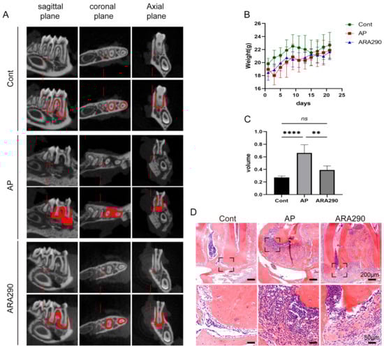 Firstly, micro-ct scanning and HE staining showed that in comparison with the control group, the AP group exhibited a radiolucency area around the root apex foramen, which demonstrated the successful establishment of the AP model in mice (Figure 5A,C,D). Furthermore, the effect of ARA290 in inhibiting alveolar bone loss was evaluated with micro-ct and HE staining experiments. Firstly, the body weight of mice in each group was recorded, and the results showed that there was no significant difference among these three groups (Figure 5B). Next, as shown in Figure 5A,C,D, ARA290 could effectively suppress the alveolar bone loss in periapical lesions. To our expectations, the results of the HE staining are consistent with the micro-ct outcome. Collectively, these findings demonstrated that ARA290 could ameliorate the alveolar bone loss that happened in the progression of AP.