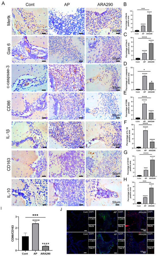 ARA290 promotes M2 macrophage polarization in periapical region. (A–H) The expression and quantification of Mertk, Gas6, c-caspase-3, CD68 and IL-1β in periapical tissue in different groups. Scale bar = 50 μm. (I) The M1/M2 ration was calculated according to the expression of CD86 and CD163. * p < 0.05, *** p < 0.005, **** p < 0.001 (J) Mertk-CD68 and Gas6-CD68 double labeling (scale bar = 20 μm) in each group. Green,c-Cas 3; red, Mertk/Gas 6; blue, DAPI.