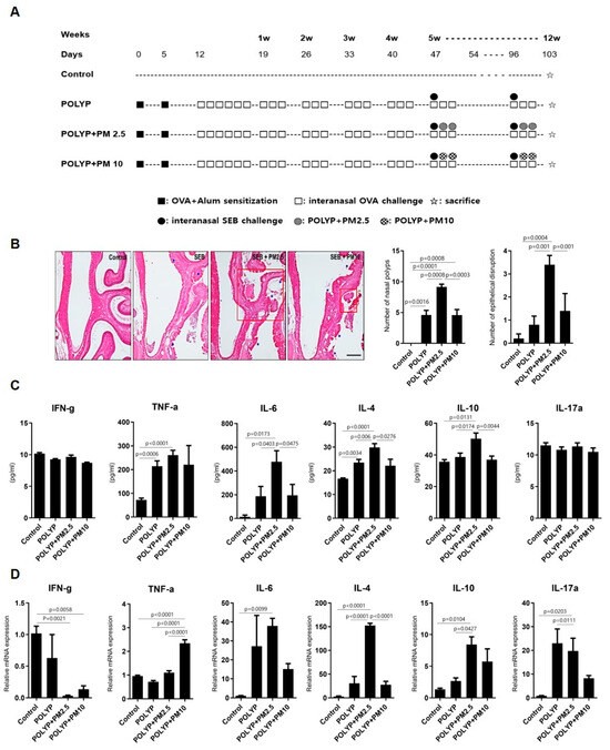 All animal experiments were reviewed and approved by the Institutional Review Board of Hallym Medical University Chuncheon Sacred Hospital (Chuncheon, Republic of Korea; IRB No.: 2020-50) and were performed under strict governmental and international guidelines for animal experiments. NPs were induced in mice according to previously described procedures [35,36]. Two types of fine dust were used in this study. For PM2.5, diesel PM Standard Reference Material (SRM) 1650b manufactured by the National Institute of Standards and Technology (NIST, Gaithersburg, MD, USA) was used, and for PM10, ERM-certified FDP reference material ERM-CZ100 (PM10-like) was used. They were purchased from SIGMA-ALDRICH (St. Louis, MO, USA). Briefly, 4-week-old wild-type (WT, BALB/c, Female) mice were divided into PBS-treated (control, n = 6), nasal polyp model (POYLP, n = 9), PM2.5-exposed NP model (POLYP + PM 2.5, n = 14), and PM10-exposed NP model (POLYP+PM 10, n = 14) groups. Mice with NP were immunized with an injection of 25 µg of ovalbumin (OVA; Sigma-Aldrich, St. Louis, MO, USA) dissolved in 300 µL complete adjuvant on days 0 and 5 (Figure 1A). At 1 week after the last injection, mice were challenged via instillation with 3% OVA in 40 µL of PBS for 5 consecutive days. Subsequently, prolonged nasal stimulation was maintained via instillation with 3% OVA in 40 µL for 12 weeks, and 20 ng of SEB in 20 µL of PBS was intranasally administrated once a week for the last 8 weeks. To examine the effects of PM2.5 and PM10, 25 µg of PM2.5 and PM10 in 20 µL of PBS were intranasally administrated twice a week for the last 8 weeks.