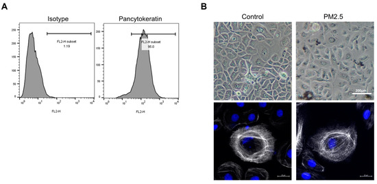 NP tissue samples were obtained from patients with CRSwNP during endoscopic sinus surgery. This study was approved by the Institutional Review Board (IRB) of Hallym Medical University Chuncheon Sacred Hospital (IRB No. 2019-10-009), and all participants provided written informed consent. NP tissue was cut into small pieces and enzymatically digested with collagenase type I (Worthington Biochemical Corporation, Lakewood, NJ, USA) and DNaseI (Sigma-Aldrich, St. Louis, MO, USA) for 30 min at 37 °C under stirring, followed by incubation in high-glucose Dulbecco’s modified Eagle’s medium (Welgene Inc., Gyeongsan, Republic of Korea) supplemented with 100 U/mL of penicillin (Sigma-Aldrich) and 100 mg/mL of streptomycin (Sigma-Aldrich). After incubation, the epithelial layer was separated from the stroma using a cell strainer, and the dissociated epithelial layers were transferred into a 50-mL conical tube, centrifuged at 200× g for 5 min, and resuspended in Airway Epithelial Cell Growth Medium (AECGM, PromoCell, Heidelberg, Germany). Thereafter, the epithelial layer in AECGM was cultured in a humidified atmosphere (5% CO2) at 37 °C. At approximately 80% confluency, HNECs from the epithelial layer were detached with trypsin-EDTA 0.25% (Gibco, Waltham, MA, USA). NP tissues for PM2.5 stimulations were harvested and rinsed in an AECGM supplemented with 100 U/mL of penicillin and 100 mg/mL of streptomycin. The biopsies were cut into multiple pieces (0.05 g) and incubated in AECGM in the absence or presence of PM2.5 for 48 or 72 h.