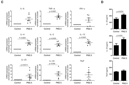 The concentrations of interferon-γ (IFN-γ), tumor necrosis factor-α (TNF-α), IL-6, IL-4, IL-10, and IL-17A in the nasal lavage fluid of the mice were measured using a Cytometric Bead Array (CBA) Mouse Th1/Th2/Th17 Cytokine Kit (BD Biosciences). The supernatants of Lin cells cultured in PM2.5 CM or in the presence of IL-2, IL-7, and IL-33 were collected and centrifuged at 1500 rpm for 5 min at 4 °C. The concentrations of IL-4, IL-5, and IL-13 in the CM were measured using a custom-made LEGENDPlex kit (BioLegend), according to the manufacturer’s instructions. Measurements were performed using FACSCalibur flow cytometer (BD Biosciences). Cytokine concentrations are expressed as pg/mL.