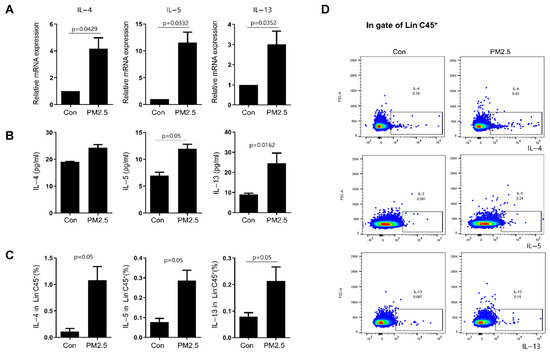 PM2.5 conditioned media (PM2.5-CM) obtained from human nasal epithelial cells after PM2.5 stimulations on innate lymphoid cells (ILCs). Lin cells were cultured in PM2.5-CM for 3 days. (A) The mRNA expression of IL-4, IL-5, and IL-13 in Lin cells was analyzed using qRT-PCR. (B) The protein expression of IL-4, IL-5, and IL-13 in culture supernatants was determined using CBA assay. (C,D) The percentage of IL-4, IL-5, and IL-13 in Lin cells was determined using flow cytometry. The graphic data represent the means ± standard error of mean (SEM; n = 3). Con = control. Statistical significance was determined using the Mann–Whitney U test.