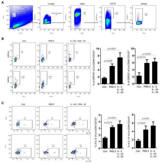PM2.5 stimulates the induction of ILC2 in HNECs. (A) Gating strategies for flow cytometric analysis of ILC2 in the TMCs. (B) Lin cells were cultured with 5% plasma in PM2.5-CM, or as a positive control, in the presence of IL-2 (20 ng/mL), IL-33 (20 ng/mL), and IL-7 (20 ng/mL) for 3 days. The percentage of CRTH2 and GATA3 expression in Lin−CD45+CD127+ cells, and the ILC2 marker were determined using flow cytometry. (C) Intracellular IL-5+ Lin−CD45+CD127+ cell, IL-13+ Lin−CD127+ were measured using flow cytometry. The graphic data represent the mean ± standard error of mean (SEM; n = 5). Con = control. Statistical significance was determined using one-way ANOVA tests.