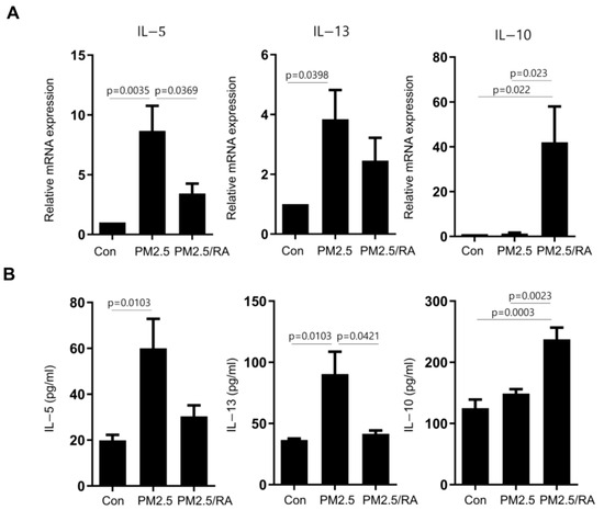 Effect of retinoid acid (RA) on PM2.5-induced ILC2 expression. (A) The mRNA expression of IL-4, IL-5, and IL-13 in Lin− cells was analyzed using qRT-PCR. (B) IL-4, IL-5, and IL-13 levels in the supernatant were analyzed using CBA assay. (C) CRTH2+CTLA4+ and intracellular IL-10+ expression in Lin−CD45+CD127+ cells was analyzed using flow cytometry (n = 6). Data are shown as means ± standard error of mean (SEM). Con = control. Statistical significance was determined using one-way ANOVA tests.