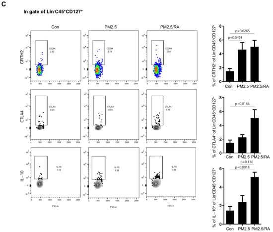 ILC2s are highly plastic cells that respond to changes in their microenvironments. RA treatment promotes the IL-10-producing phenotype of ILC2. Therefore, we investigated whether RA treatment could modulate PM2.5-CM-induced expression of ILC2. RA treatment significantly suppressed PM2.5-CM-induced upregulation of IL-5 and IL-13 expression in Lin cells at both the mRNA and protein levels. In contrast, RA treatment significantly upregulated IL-10 expression at both the mRNA and protein levels (Figure 5A,B). Although the ILC2 population was unaffected, RA treatment increased the expression of CTLA4, which is a phenotype of ILCreg (p = 0.0164), and the expression of IL-10 in Lin−CD45+CD127+ cells (p = 0.0018) (Figure 5C). Overall, these findings suggest that RA attenuates type 2 immune response via modulation of the ILC2 phenotype.