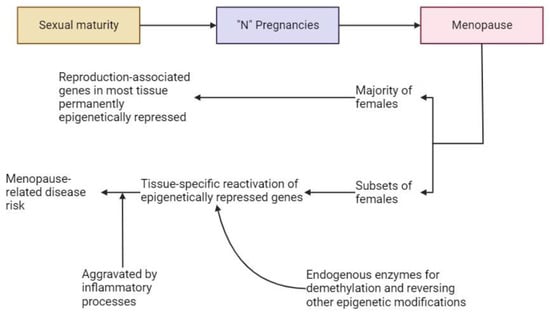 Hart, D.A. The Heterogeneity of Post-Menopausal Disease Risk: Could the Basis for Why Only Subsets of Females Are Affected Be Due to a Reversible Epigenetic Modification System Associated with Puberty, Menstrual Cycles, Pregnancy and Lactation, and, Ultimately, Menopause? Int. J. Mol. Sci. 2024, 25, 3866. https://doi.org/10.3390/ijms25073866