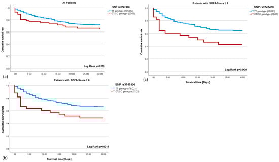 (a–c): The 30-day survival rate in sepsis using the Kaplan–Meier analysis. (a). The survival curve of the T-allele carriers (blue) and C-allele carriers (red) for the single nucleotide polymorphism (SNP) rs3747406 (HR = 1.36; p = 0.215). (b): Septic patients with a sequential organ failure assessment (SOFA) score ≥ 6 and T-allele (blue), and septic patients with a SOFA score ≥ 6 and C-allele (red) for the SNP rs3747406 (HR = 1.90; p = 0.017). (c): Septic patients with a SOFA score ≥ 8 and T-allele (blue), and septic patients with a SOFA score ≥ 8 and C-allele (red) for the SNP rs3747406 (HR = 2.027; p = 0.011).