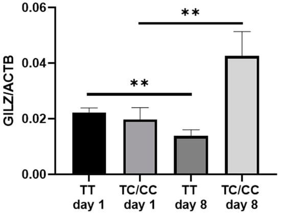 Quantitative glucocorticoid-induced leucine zip (GILZ) mRNA expression in all rs3747406 SNP genotypes on day 1 and day 8 of sepsis diagnosis. The quantitative gene expression was normalized to the housekeeping gene ß-actin, computed using the 2−∆CT method. TT day 1 to day 8 n = 87; ** p = 0.0059; TC/CC day 1 to day 8 n = 13, ** p = 0.0093.