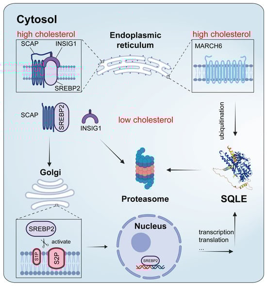 Zhang, L.; Cao, Z.; Hong, Y.; He, H.; Chen, L.; Yu, Z.; Gao, Y. Squalene Epoxidase: Its Regulations and Links with Cancers. Int. J. Mol. Sci. 2024, 25, 3874. https://doi.org/10.3390/ijms25073874