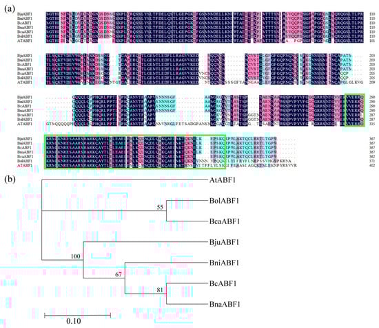 Phylogenetic analysis of ABF1. (a) Amino acid sequence alignment of ABF1 in seven cruciferous plant species. Identical and similar amino acids are indicated with black and pink shading, respectively, while highly variable amino acids are represented with blue shading. The part marked by the green rectangle is the BRLZ domain. (b) Phylogenetic tree. Phylogenetic tree was constructed using MEGA X (neighbor-joining algorithm, bootstrap replications = 1000). The numbers beside the branches represent bootstrap values from 1000 replicates. Relative changes along the branches are indicated by the scale bar. Bc: Brassica campestris. Bna: Brassica napus. Bju: Brassica juncea. Bni: Brassica nigra. Bol: Brassica oleracea. Bca: Brassica carinata. At: Arabidopsis thaliana.