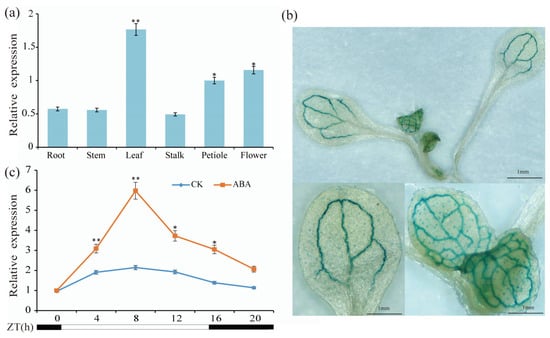 To obtain the tissue-specific expression of BcABF1 in Pakchoi, qRT-PCR analysis was completed on the root, stem, leaf, stalk, petiole, and flower. Our findings revealed that the expression level of BcABF1 was the highest expression in the leaves, with the second highest expression observed in the flowers (Figure 2a). To advance our understanding of the BcABF1 expression pattern, we engineered a GUS reporter system under the control of the BcABF1 promoter (pBcABF1:GUS) and transformed it into Arabidopsis thaliana (Col-0), resulting in the creation of the pBcABF1:GUS/Col. GUS staining of this line revealed a notable staining intensity in the leaves, primarily concentrated in the vascular and stoma (Figure 2b). Previous research has documented diurnal rhythm variations in ABF [43]. We conducted a qRT-PCR analysis to assess the diurnal variations in ABF1 expression over a 24 h period in 14 d Pakchoi seedlings (Figure 2c). This analysis revealed that the expression of BcABF1 was significantly higher during daylight hours compared to nighttime. Notably, the expression peaked at Zeitgeber Time (ZT) 8. Following this peak, there was a gradual decrease in expression. Subsequently, to explore ABF1’s responsiveness to ABA, we applied 50 μM ABA to 14-day Pakchoi seedlings at ZT0. Our findings revealed that, relative to untreated Pakchoi, BcABF1’s expression levels surged within the initial 8 h window post-treatment, diminished noticeably from 12 to 24 h, and eventually stabilized at an elevated level by the 24 h mark. Specifically, for post-ABA treatment, the most substantial shift in BcABF1 expression occurred at ZT8, where it was threefold higher than that in untreated plants (Figure 2c).