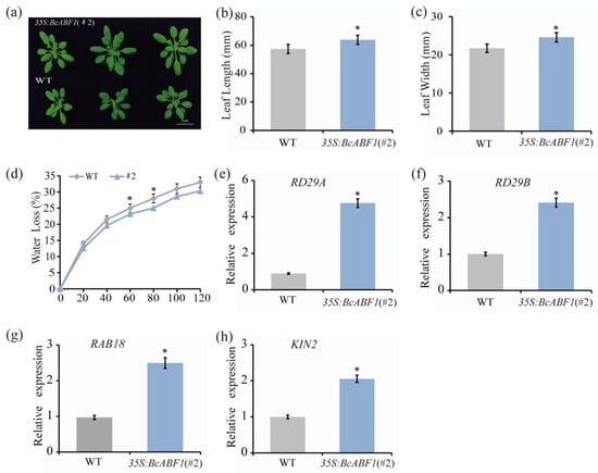 Phenotypic indicators analysis of BcABF1 overexpressing Arabidopsis. (a) The phenotype of Arabidopsis overexpressing 35S:BcABF1. (b) Leaf length in 35S:BcABF1. The largest leaf from each individual 28-day 35S:BcABF1 and WT was selected and identified, and then its length was accurately measured. (c) Leaf width in 35S:BcABF1. The largest leaf from each individual 28-day 35S:BcABF1 and WT was selected and identified and then its width was accurately measured. (d) Rate of water loss in leaves of 35S:BcABF1. Leaves from 21-day-old 35S:BcABF1 were selected, and measurements were taken every 20 min. (e–h) Relative expression levels of ABA signaling response genes in 35S:BcABF1. The data represent the average of three biological replicates (* p < 0.05, Student’s t-test).