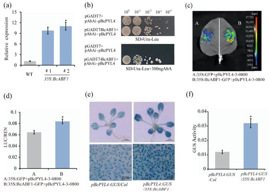 BcABF1 directly activates BcPYL4 expression. (a) Relative expression level of BcPYL4 in 35S:BcABF1. (b) Y1H analysis showing direct binding of BcABF1 protein to BcPYL4 promoter. (c) Imaging of LUC activity showed that BcABF1 activates the expression of BcPYL4. (d) The ratio of LUC/REN of (c). (e) GUS staining of 17-day-old pBcPYL4:GUS/Col and pBcPYL4:GUS/35S:BcABF1 lines in which GUS gene expression was driven by the BcPYL4 promoter. (f) Expression of GUS in pBcPYL4:GUS/Col and pBcPYL4:GUS/35S:BcABF1 lines from (e). Data represent the average of three biological replicates (* p < 0.05, Student’s t-test).