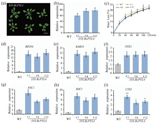 To further investigate the role of BcPYL4 in the ABA signaling pathway, a stable Arabidopsis line expressing 35S:BcPYL4 was established (#7, #8, and #12) (Figure 5a,b). We also conducted leaf water loss experiments on three lines of 35S:BcPYL4 (Figure 5c). The results indicated that there was a reduction in the rate of leaf water loss in these three lines compared to WT, especially at 60 min and 100 min. This is similar to the dehydration phenotype of our BcABF1 overexpressing Arabidopsis. To advance our exploration of BcPYL4′s role in enhancing drought resistance, we conducted an analysis focusing on the expression of drought response genes RD29A and RAB18 (Figure 5d,e). In the 35S:BcPYL4 strains, there was a significant increase in the expression levels of RD29A and RAB18, reaching ten times that of the WT. The gene expression pattern observed in 35S:BcPYL4 closely parallels that seen in 35S:BcABF1, indicating a uniform enhancement of drought resistance mechanisms facilitated by BcPYL4.