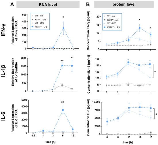 2.2. KSRP−/− Mice Show Higher Protein Expression of IFN-γ, IL-1β and IL-6 in Response to Stimulation