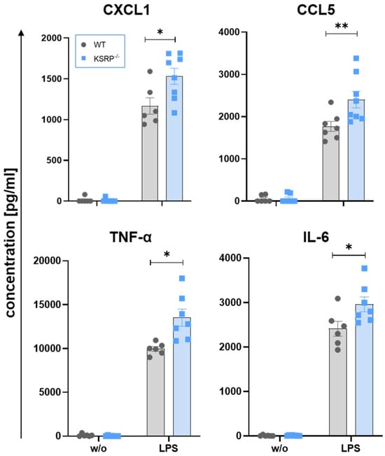 2.4. KSRP−/− Primary Macrophages from the Peritoneum Produce Higher Levels of Pro-Inflammatory Cytokines in Response to Stimulation