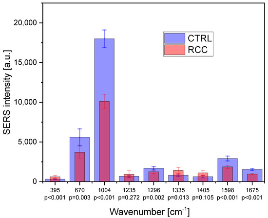 - Buhas, B.A.; Toma, V.; Crisan, N.; Ploussard, G.; Maghiar, T.A.; Știufiuc, R.I.; Lucaciu, C.M. High-Accuracy Renal Cell Carcinoma Discrimination through Label-Free SERS of Blood Serum and Multivariate Analysis. Biosensors 2023, 13, 813. [Google Scholar] [CrossRef]
