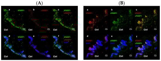 Small UC pieces were fixed in 4% (w/v) paraformaldehyde in 0.05 M phosphate-buffer (PB), cryoprotected with 30% (w/v) sucrose in PB supplemented with 0.1% (w/v) Na-azide, embedded in Tissue-Tek® O.C.T.™ obtained from Sakura Finetek Europe (Alphen aan den Rijn, The Netherlands), cryo-sectioned (16 µm), and mounted on Superfrost™ ultraplus® microscope slides from Thermo Scientific (Waltham, MA, USA). The immunolabeling process involved permeabilization with 0.1% (v/v) Triton X-100 in PB, followed by blocking the nonspecific antibody binding sites with 4% (w/v) bovine serum albumin and 5% (v/v) normal goat serum in PB. For immunolabeling, primary antibodies were diluted in a ratio of 1:100, and the sections were incubated overnight at 4 °C. Primary antibodies: rabbit anti-PARP-1 monoclonal (C.384.8): MA5-15031; Invitrogen (Waltham, MA, USA), mouse anti-cleaved PARP-1 monoclonal (194C1439): sc-56196; Santa Cruz Biotechnology (Dallas, TX, USA), rabbit anti-CNOT1 polyclonal: ab234642; Abcam (Cambridge, UK), mouse anti-Pol II (RPB1) monoclonal (A-10): sc-17798 Santa Cruz Biotechnology (Dallas, TX, USA), rabbit, anti-cleaved Casp3 polyclonal: ab2302; Abcam (Cambridge, UK). Secondary antibodies were diluted in to 1:1000 and used alone or in combination in case of double labelling: goat anti-mouse or anti-rabbit IgG H & L conjugated with Alexa Fluor® 488 or 647 (ab150077; ab150113; ab150115; ab150079, respectively Abcam (Cambridge, UK) for 2 h in room temperature. Cell nuclei were identified by counterstaining with 1 µg/mL 4′, 6-diamidino-2-phenylindole (DAPI) (D9542) from Sigma-Aldrich (St. Louis, MO, USA). Sections were mounted in Antifading BrightMount/Plus aqueous mounting medium: ab103748 Abcam (Cambridge, UK) for confocal microscopic analysis.