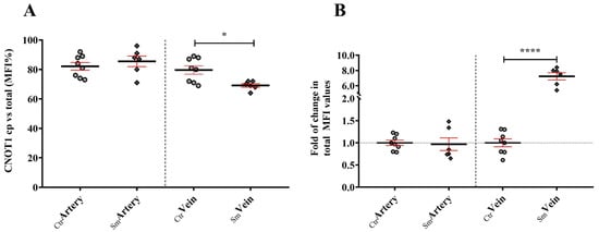 Sections were examined using a confocal laser scanning microscope, ZEISS LSM 880 equipped with Axiocam 503 mono (Carl Zeiss Microscopy GmbH, Germany). Image acquisition was performed with Zen 2.1 (black) software. Imaging of arteries and veins of each sample were captured in at least 5 independent fields of view. For antibody-labeled sections, with the following parameters excitation with Argon (488 nm) laser line for Alexa 488 fluorophore, Helium-Neon (633 nm) laser line for Alexa 647 fluorophore, violet (405 nm) laser line for DAPI, with detection filters in the range: 493–591 nm, 630–755 nm and 410–479 nm; pinhole = 1 airy unit. Eight-bit images were semiquantified with ImageJ 1.50i software (NIH, Bethesda, MD, USA). Visualization of sections were done using a confocal laser scanning microscope, ZEISS LSM 880 with Axiocam 503 mono (Carl Zeiss Microscopy GmbH, Germany). Capture of images was done with Zen 2.1 (black) software. For each sample (including both artery and vein), image acquisition was done from at least 5 independent fields of view or region of interest (ROI). Immunolabeling detection was done with the following protocol parameters: excitation with Argon (488 nm) laser line for Alexa 488 fluorophore, Helium-Neon (633 nm) laser line for Alexa 647 fluorophore, and the violet (405 nm) laser line for DAPI, having the detection filters in the range: 493 nm–591 nm, 630 nm–755 nm and 410 nm–479 nm; pinhole = 1 airy unit. Eight-bit images were semiquantified with ImageJ 1.50i software (NIH, USA).