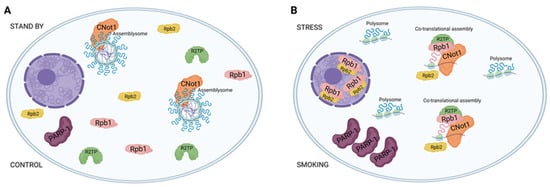 32]. Notably, in Sm samples, RPB1 becomes nuclear compared to control samples where RPB1 is predominantly cytoplasmic. We propose that in control samples, CNOT1 is present in cytoplasmic condensates, likely with assemblysomes, keeping it away from RPB1-RPB2 assembly processes. The RPB1 level already in the nucleus under steady-state conditions is sufficient to maintain gene expression homeostasis. Upon stress, assemblysomes transition from their phase-separated state, releasing CNOT1 and making it more accessible for RPB1 and RPB2 assembly processes. Consequently, more RNA polymerase II can enter the nucleus, leading to enhanced global transcription, as evidenced by elevated protein levels of PARP-1 proteins measured by mean fluorescence intensity in Sm samples compared to control (