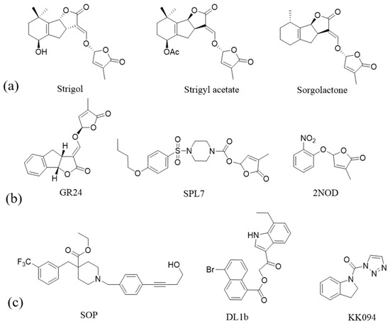- Nakamura, H.; Asami, T. Target sites for chemical regulation of strigolactone signaling. Front. Plant Sci. 2014, 5, 623. [Google Scholar] [CrossRef]
