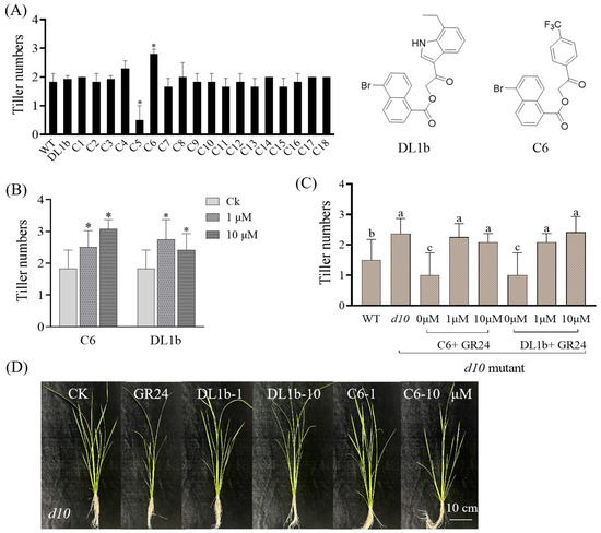 2.2.1. Effect of the Target Compounds on Rice Tillering of Wild Type and d10 Mutant