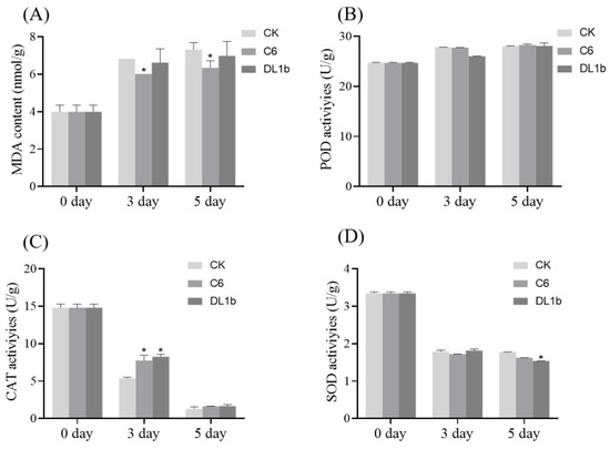 2.2.4. Effect on MDA (Malondialdehyde) Levels and SOD (Superoxide Dismutase), POD (Peroxidase), CAT (Catalase) Activities in Detached Rice Leaves in Response to C6 Application