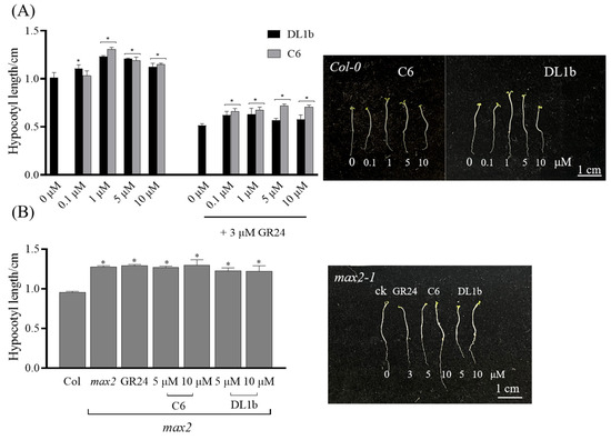 2.2.5. Activity of C6 on Arabidopsis Hypocotyl Elongation of Wild Type and max2 Mutant