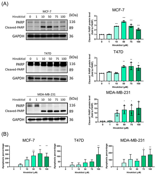 Effect of hinokitiol on apoptosis progression in breast cancer MCF-7, T47D, and MDA-MB-231 cells were cultured in a 6 cm dish and treated with hinokitiol for 48 h. Western blot was used to determine (A) PARP protein expression and (B) automated fluorescence cell counter ADAM-MC was used to measure the apoptosis percentage. Data are presented as mean ± SD (n = 3–4). * p < 0.05; ** p < 0.01; *** p < 0.001 as compared with control group.