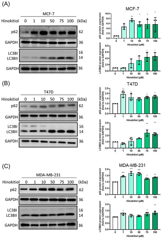 Effect of hinokitiol on autophagy-related protein expression. (A) MCF-7, (B) T47D, and (C) MDA-MB-231 cells were cultured in a 6 cm dish and treated with hinokitiol for 48 h. Western blot was used to determine p62 and LC3BII/I protein expression. Data are presented as mean ± SD (n = 3–4). * p < 0.05; ** p < 0.01; *** p < 0.001 as compared with control group.